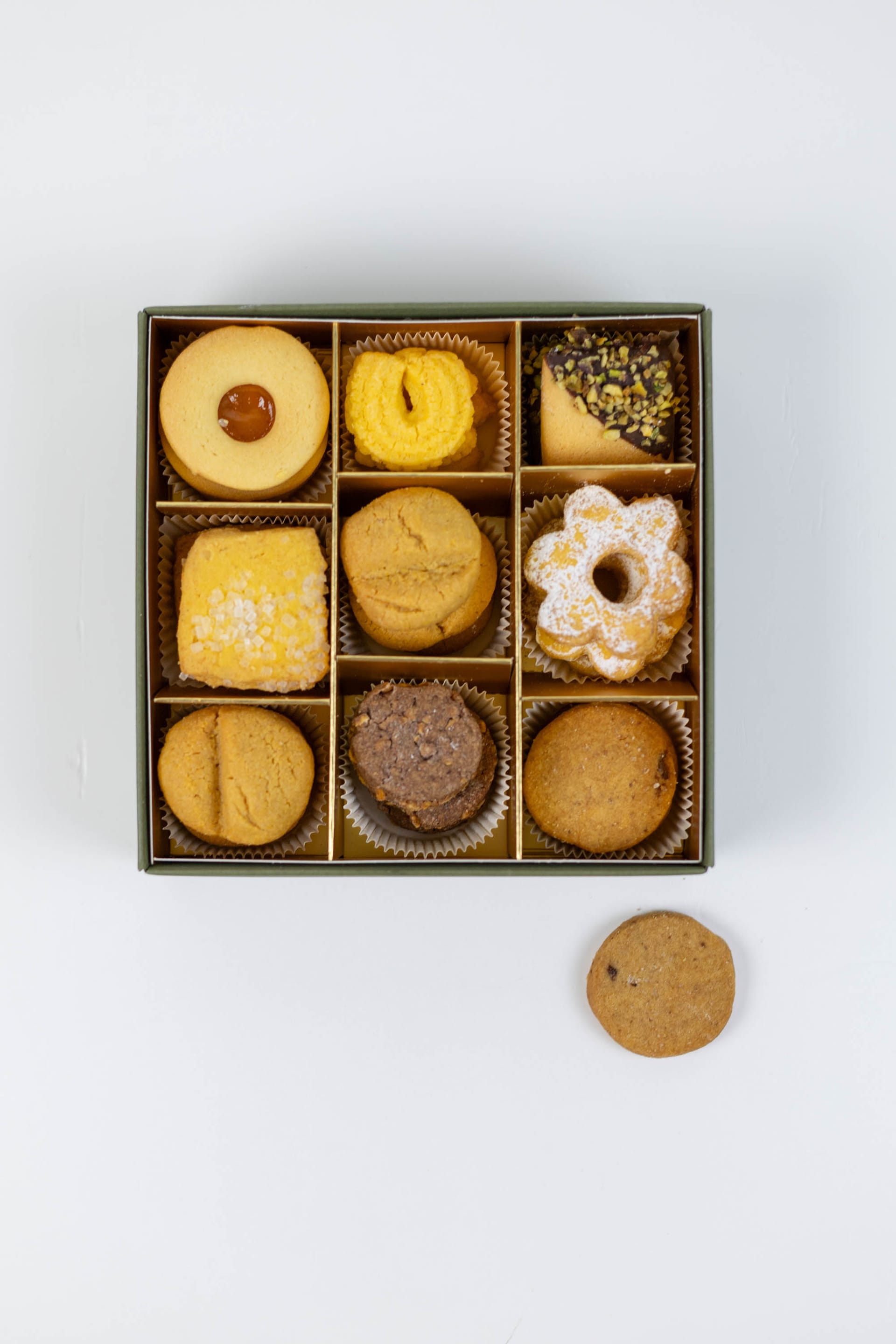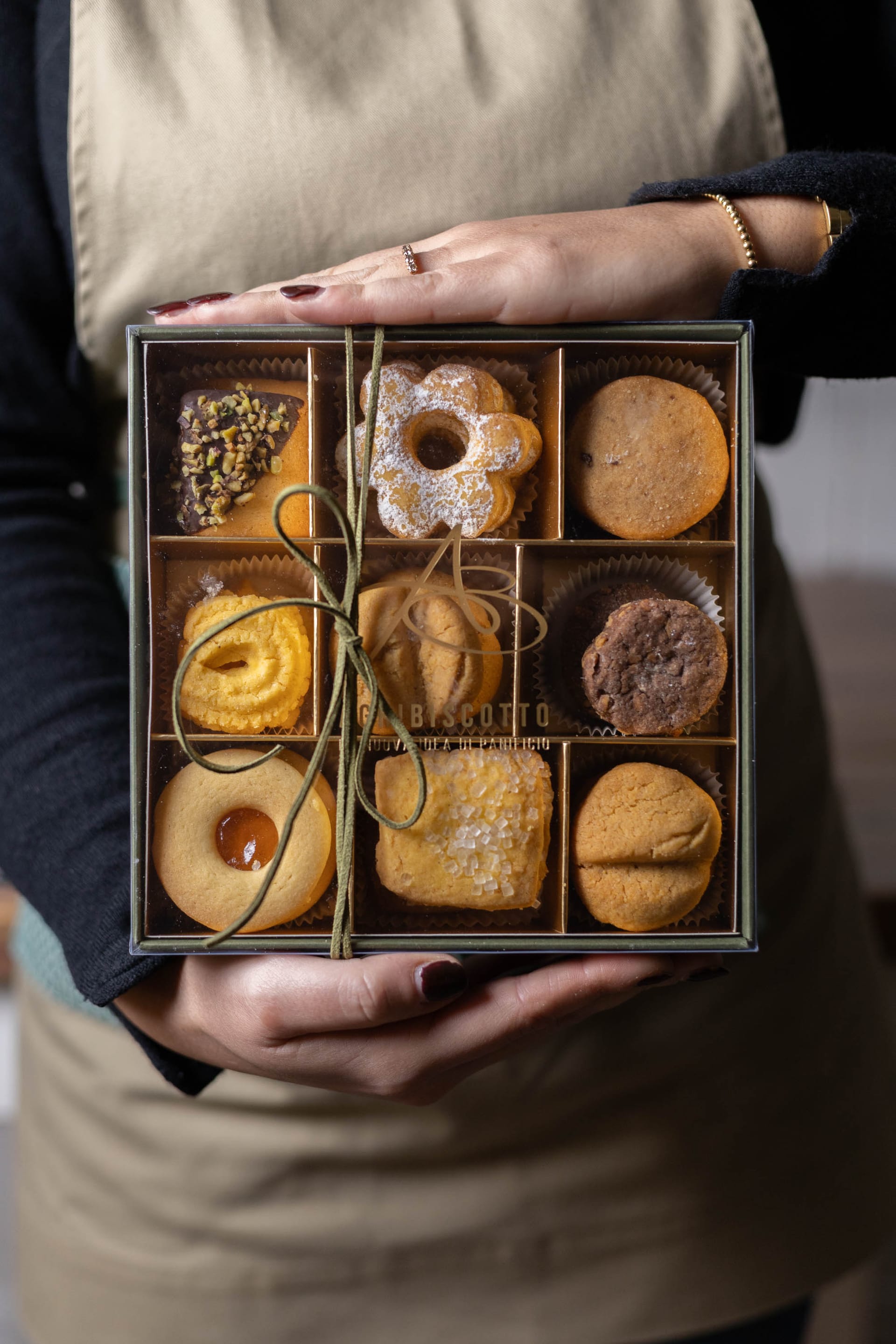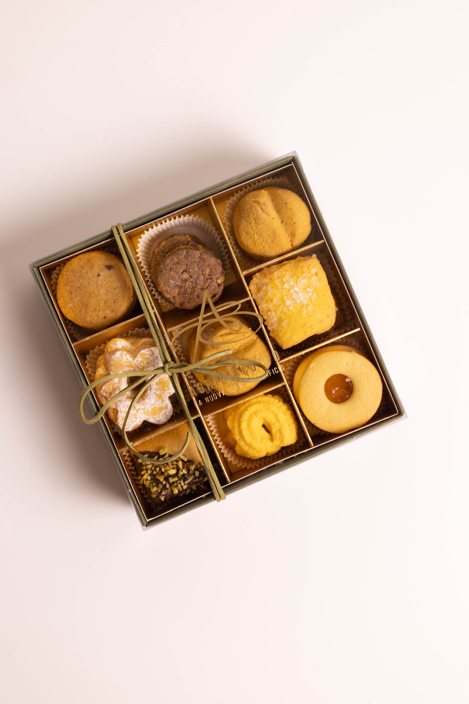 La nostra confezione mista racchiude una selezione raffinata di biscotti artigianali, tutti preparati con ingredienti di grande qualità: burro di latteria, farine selezionate, uova fresche e accenti di cacao, cioccolato, nocciole Piemonte IGP. Ogni varietà è distinta, ma tutte si uniscono in un elegante assortimento che conquista al primo sguardo. Il packaging curato, con finitura elegante e chiusura protetta, ne fa un regalo perfetto o un piacere da concedersi. Aprendo la confezione, si scopre la friabilità tipica della frolla, la croccantezza della granella e la profondità del cioccolato: un viaggio goloso tra sapori autentici.